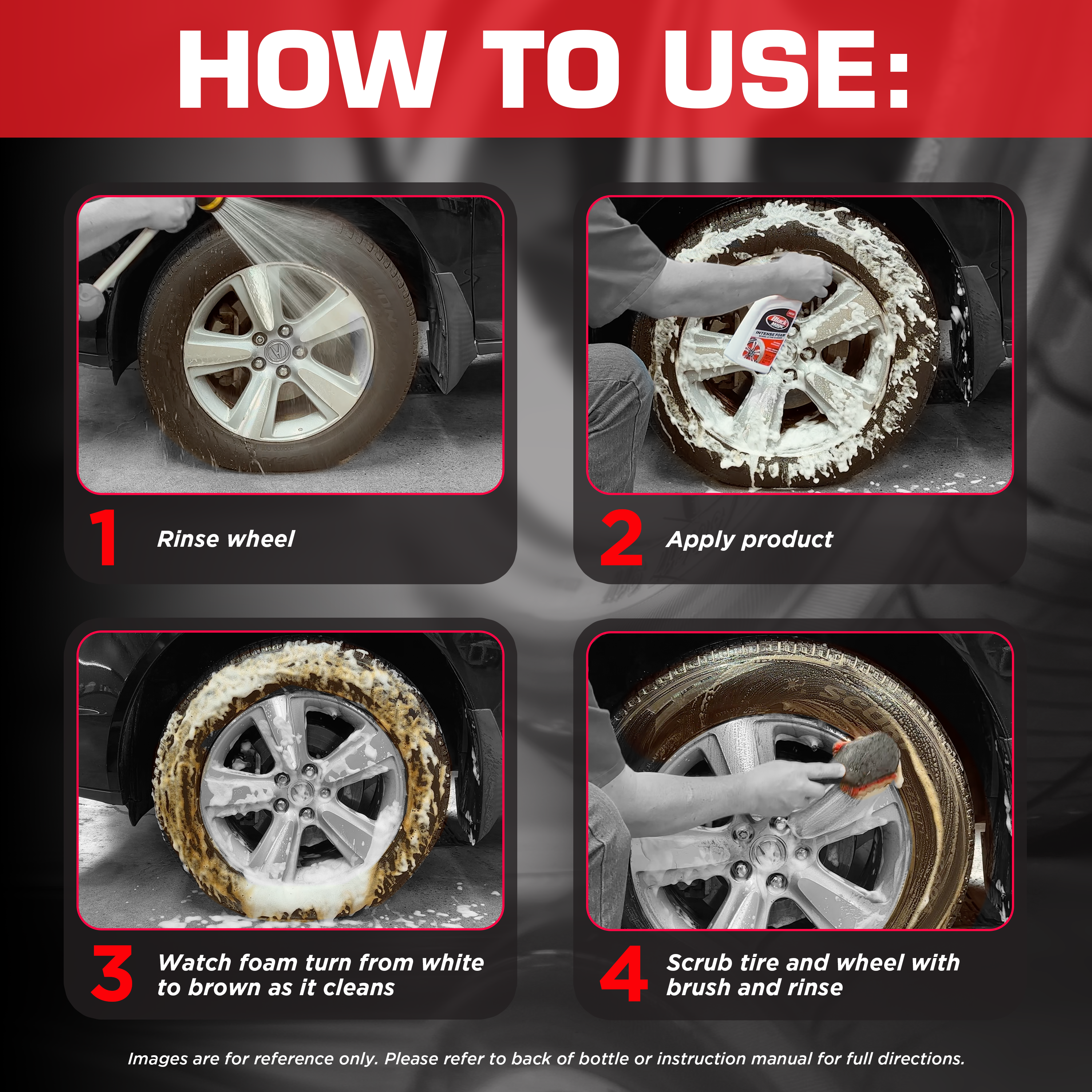 - Rinse wheel and tire before applying product
