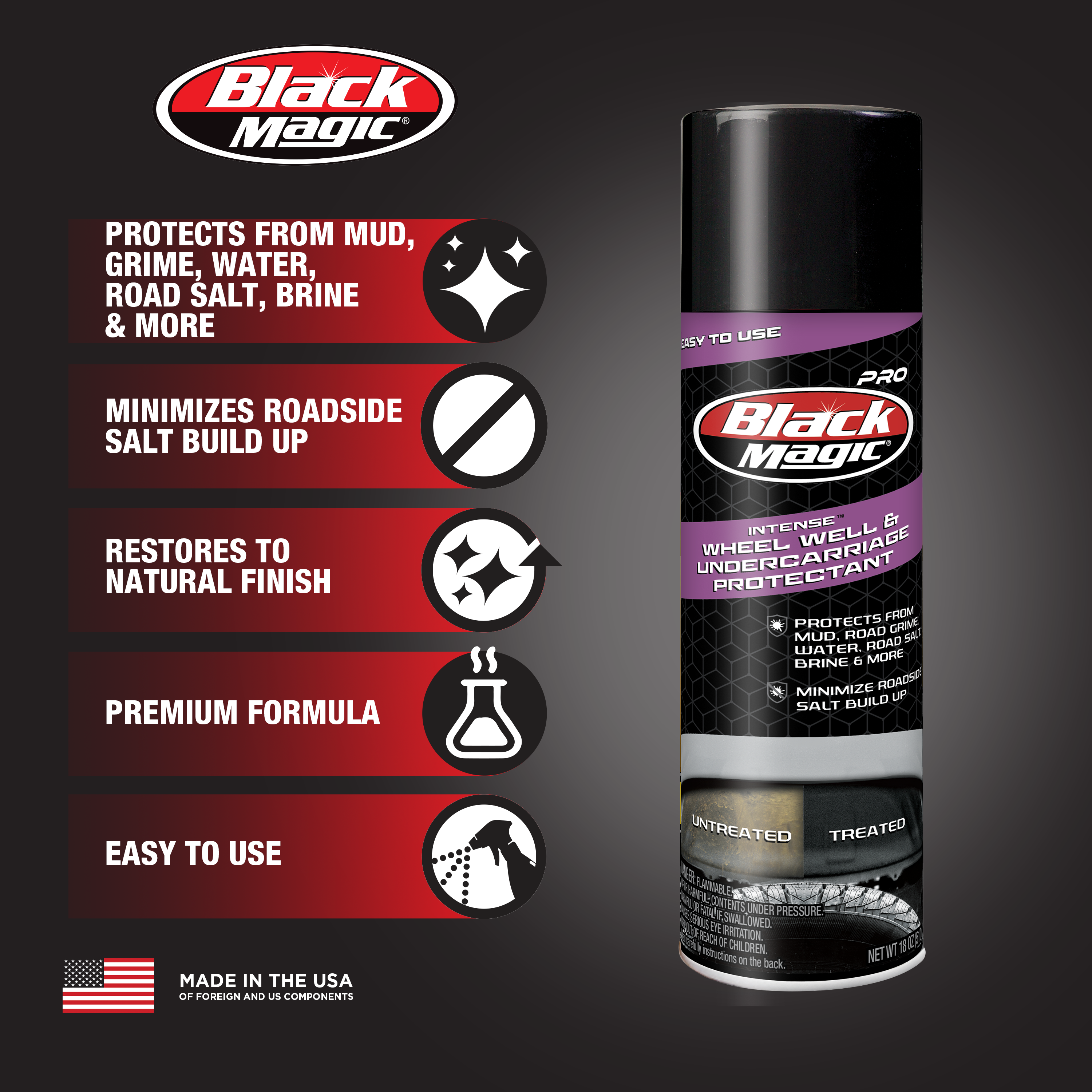 - Spray directly on wheel wells following the arc for maximum coverage. For undercarriage, spray directly on surfaces for added protection