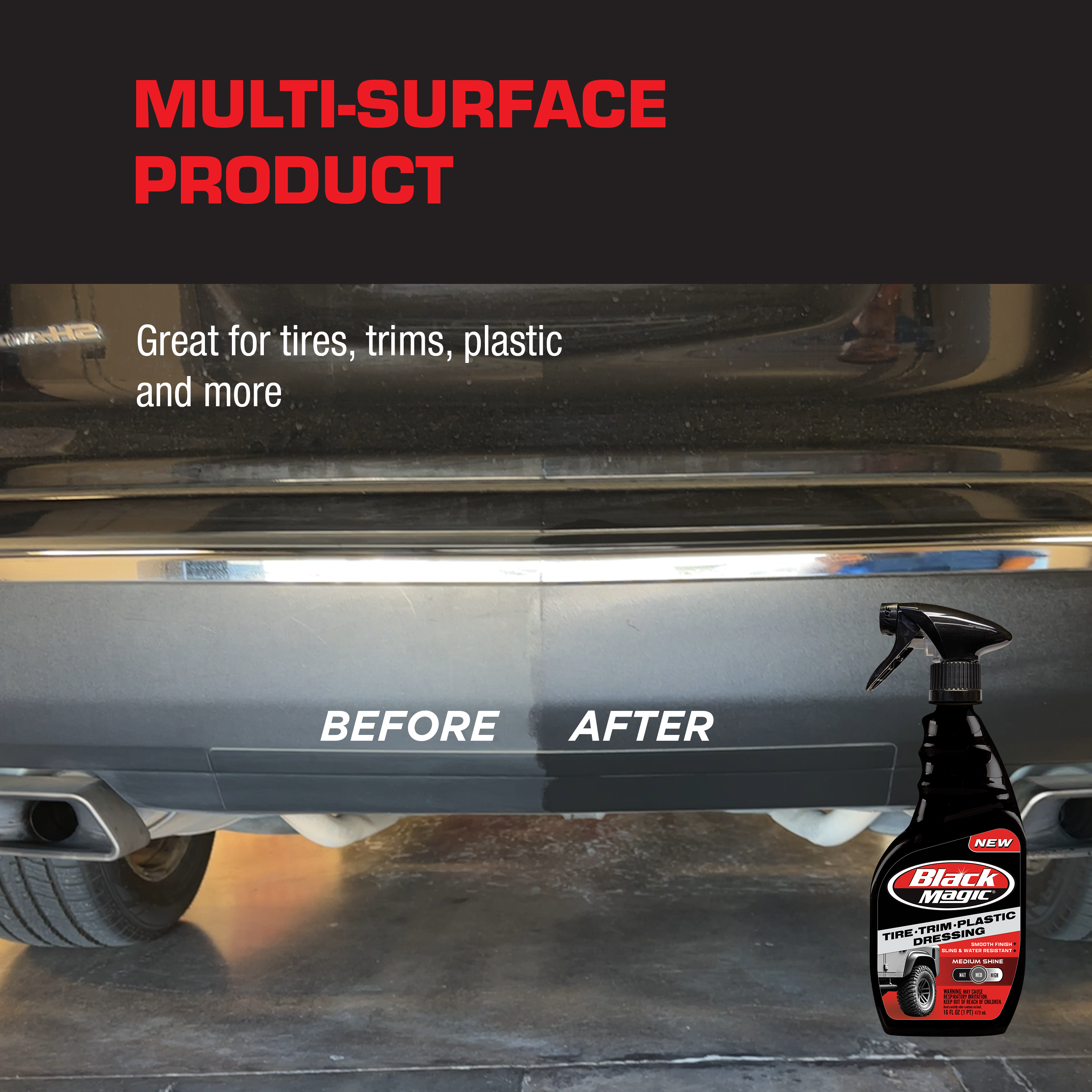 - Multi-Surface: adds shine to different car surfaces like tire trim and plastics. (Safe for interior use)