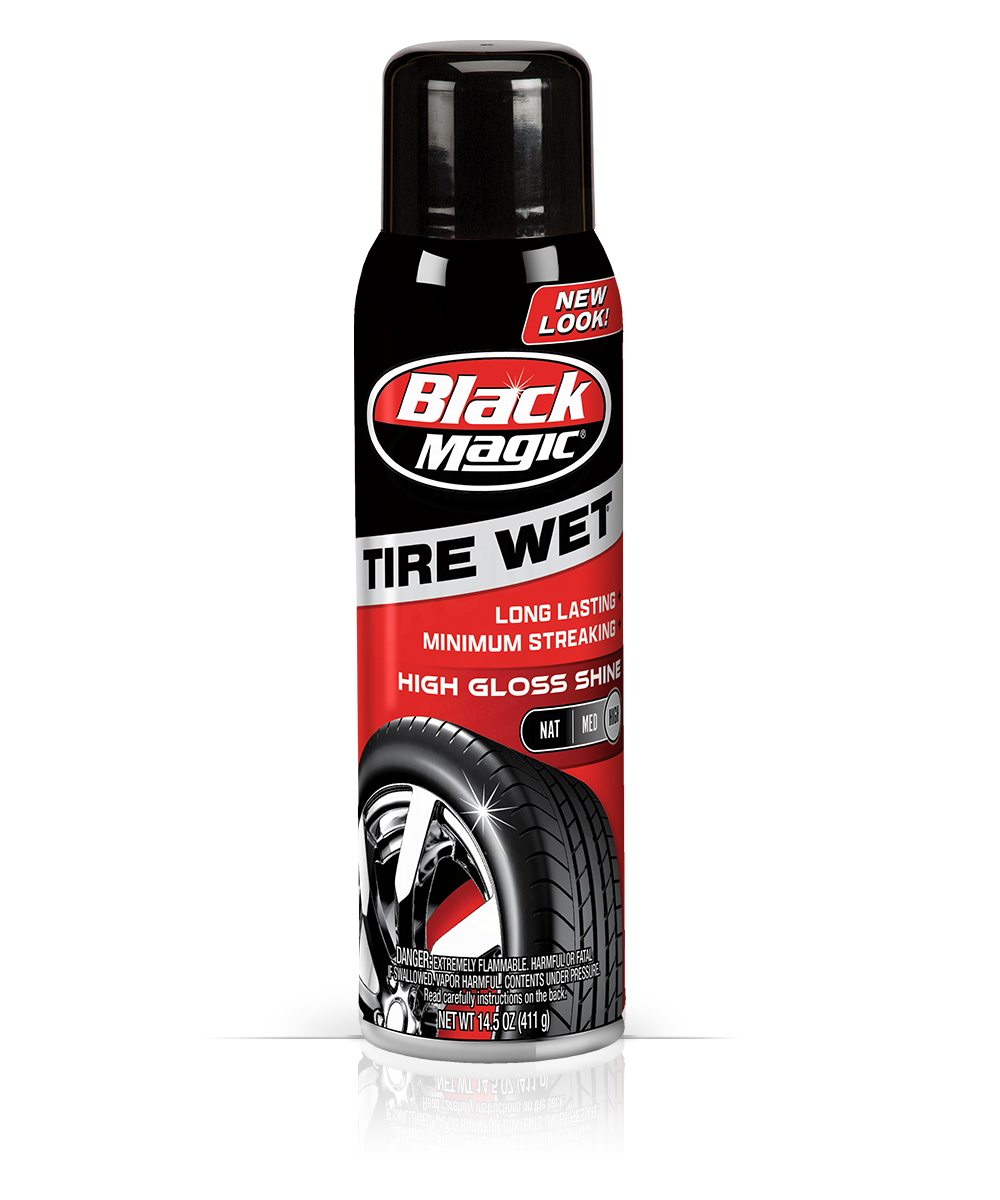 With one gentle spray of Black Magic® Tire Wet® Spray your tires look wet black and glossy. The Tire Wet formula features a combination of polymers and high molecular weight silicones to deliver a long-lasting, high-gloss shine. It is easy to use – spray and go – no wiping. Plus Tire Wet features a pleasant cherry scent.